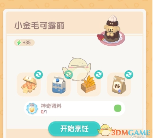 小金毛可露丽的食材配方为:鸡蛋1个 + 牛奶1份 + 麦子1份 + 咖啡豆1份