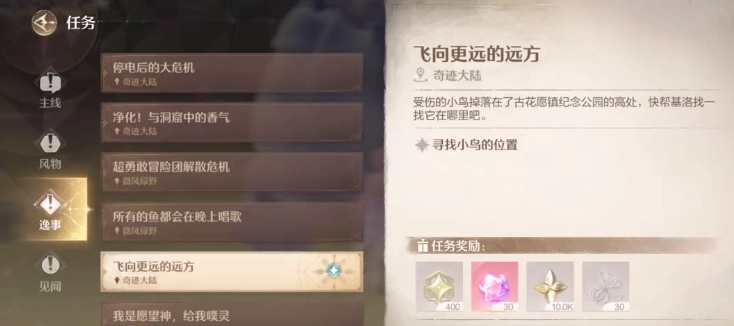 接到这个任务后,受伤的小鸟会落在纪念公园的高处。玩家要尽快找回这只小鸟,完成任务就能得到一根纯真丝线,还能拾取受伤小鸟掉落的羽毛。掉落的羽毛用途广泛,比如可直接用来制作配饰。要是大家留意这些方面,自然就能顺利获得奖励。