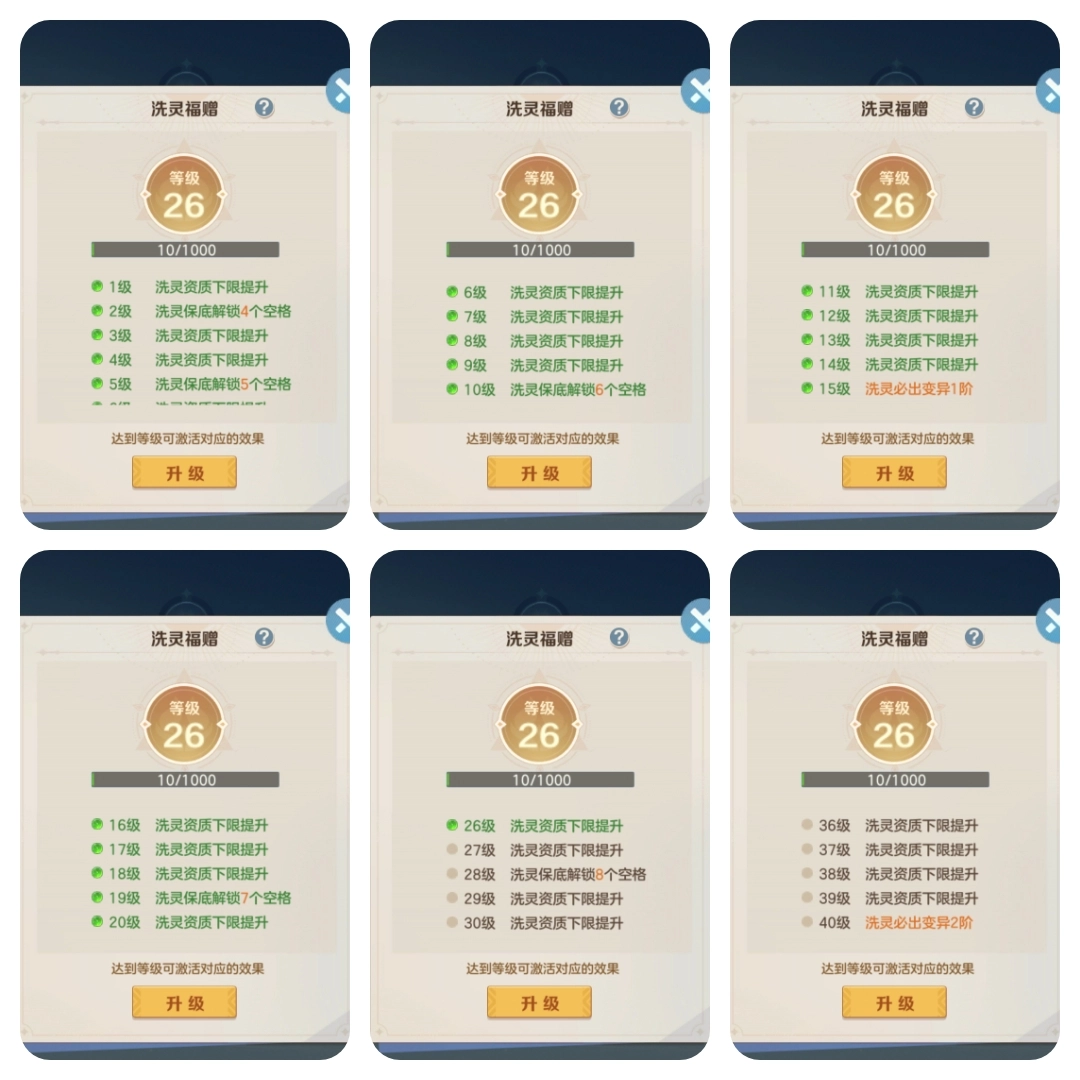 洗灵总共分为40级,从图中可知,随着洗灵等级的提升,会带来三方面的提升,分别是洗灵资质的上下限增加、保底空格的解锁以及必出变异资质。下面我们就围绕这三个方面,来讲解洗灵系统的运用。