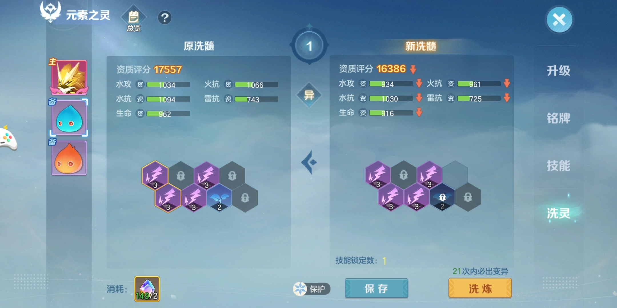 每次对元素进行洗灵时,都有一定概率出现变异资质。当洗灵等级提升至特定的15级以及满级40级时,每次洗灵必定会分别出现变异1阶和变异2阶。变异资质具备诸多优势,其中最基础的一点是,变异后资质会得到大幅度提升,在同等洗灵等级条件下,元素的初始攻击、抗性以及生命倍率,相比非变异状态都会大幅提升。此外,拥有变异资质的灵决技能空格数量,会多于非变异资质的情况。