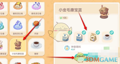 2、进入烹饪页面后,在食谱中找到小金毛康宝蓝。接着准备2份牛奶、1份咖啡豆以及1份咖啡,最后点击页面右下角的“开始烹饪”按钮。