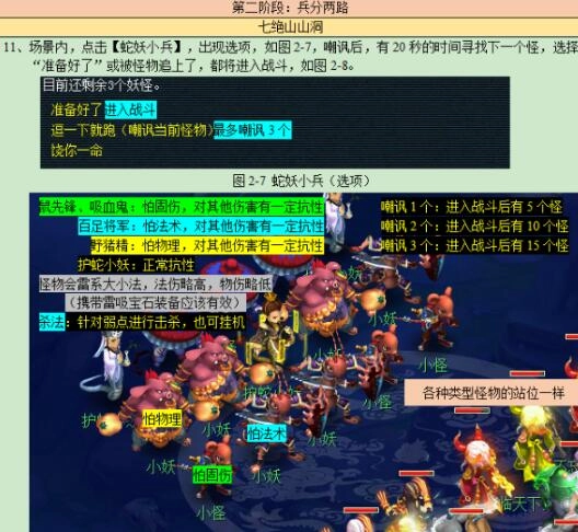 1. 当成功击杀15个【蛇妖喽啰】之后,场景之中会出现4个【红磷蛇妖】。这4个里面仅有1个是真身,而且只有在进入战斗状态之后,才能知晓哪个是真的。