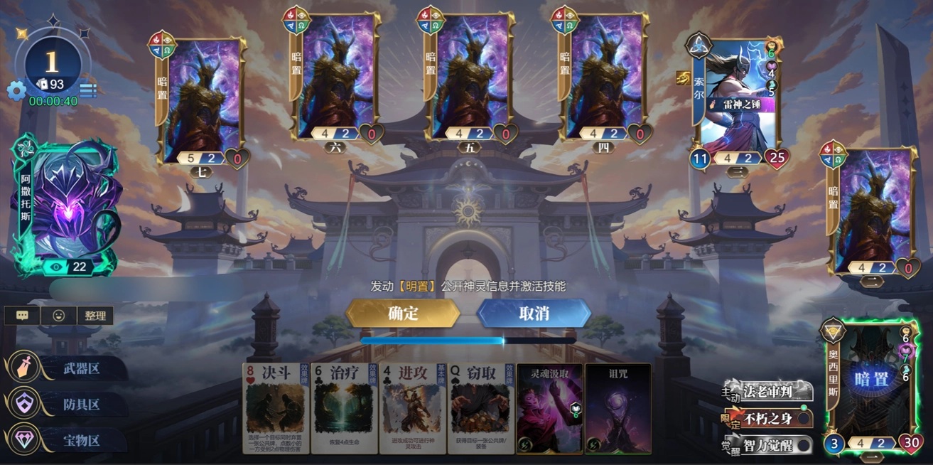 隐匿抑或显露?这是个值得思索的问题!游戏伊始,全部神灵皆处于暗置情形, 一旦使用或者触发技能,神灵便会被明置。 每当回合开启之际,你能够自主决定是否将神灵明置。 究竟是选择韬光养晦,还是选择先声夺人? 你的抉择将会左右战局的发展态势!