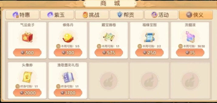 3. 侠义值获取途径多样,日常帮助他人击杀天师、妖王,或是协助探索藏器阁,甚至赠送物品,都能积累侠义值。侠义值获取相对轻松,每周可用侠义值兑换修炼丹,每个修炼丹需100侠义值,每周限兑5个。