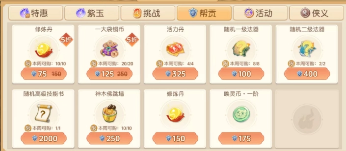 2. 帮贡兑换方面,每周能够使用帮贡来兑换10个五折修炼丹。要是你的帮贡较为充裕,也能用150帮贡换一个修炼丹,但这种方式并不推荐,因为比较浪费帮贡,相比之下,用铜币点修更为合适。