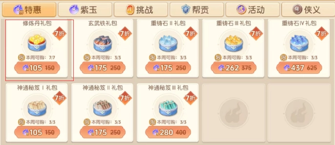 1. 绑玉购买修炼丹礼包:仅需105绑玉就能入手,内含5个修炼丹。这个礼包三卡玩家一定得买,每周可获取35个修炼丹。游戏里绑玉获取途径丰富,众多活动都能拿到。就算是零氪玩家,也无需担忧因缺少绑玉而无法购买每周的修炼丹礼包。
