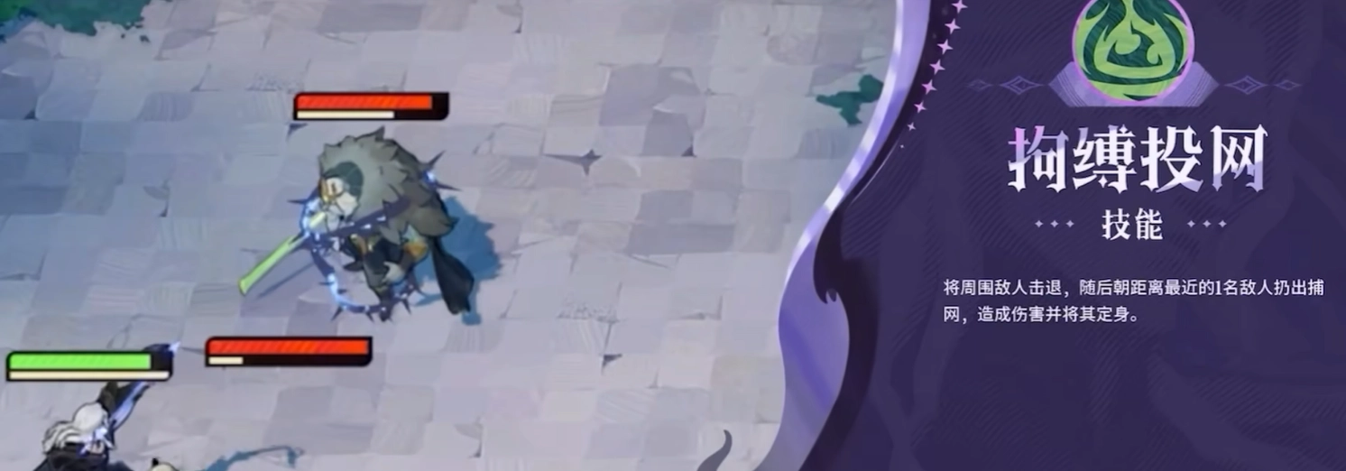 他的第三个技能“拘缚投网”,可不简单。它不仅具备控制效果,还能通过击退敌人并给目标施加定身效果,为团队营造输出空间。此技能的控制效果至关重要,特别是当敌人发起冲锋时,度厄能凭借这招轻松逼退敌人,还能精准锁定目标,极大地保障了自身的输出空间。