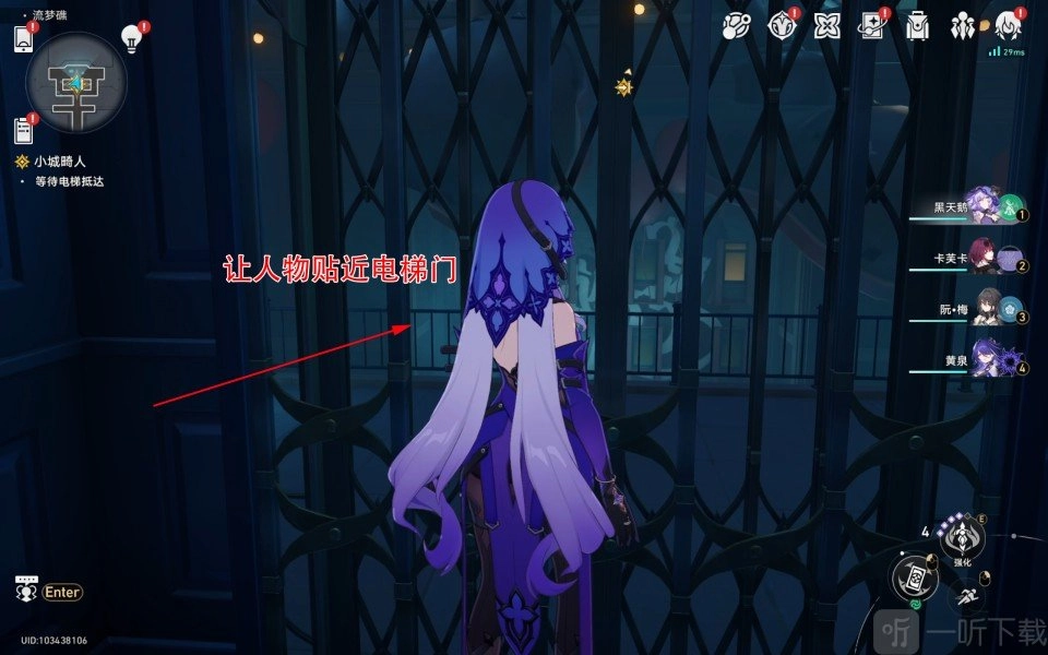 第一步,抵达“流梦礁”,接着传送到一层的锚点“窄巷”,随后沿直线一直前行,最后走进下图所示点位处的电梯。