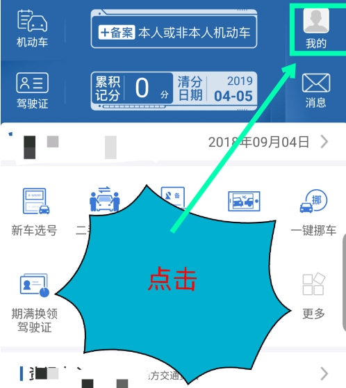 在交管首页,点击顶部已登录的“我的”选项,具体位置如图所示。