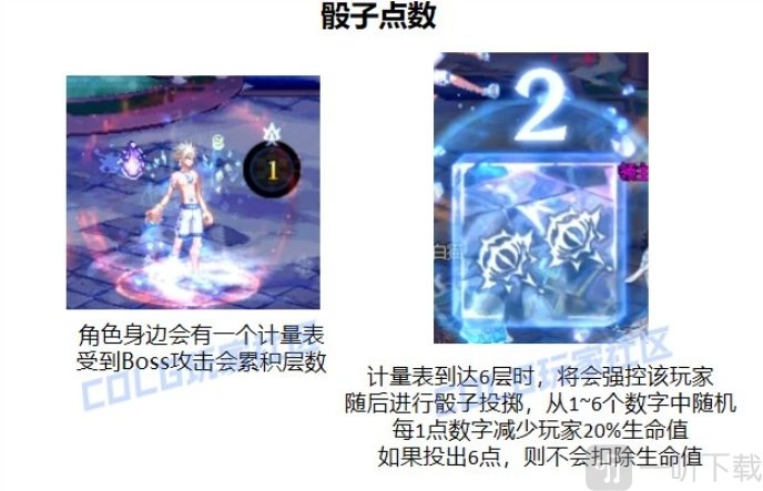 每次点名完毕,场地中央的骰子便会炸裂开来,随即出现彩色区域。角色必须在读条【绝望的黑暗】结束之前,进入到彩色区域,以此躲避爆炸。