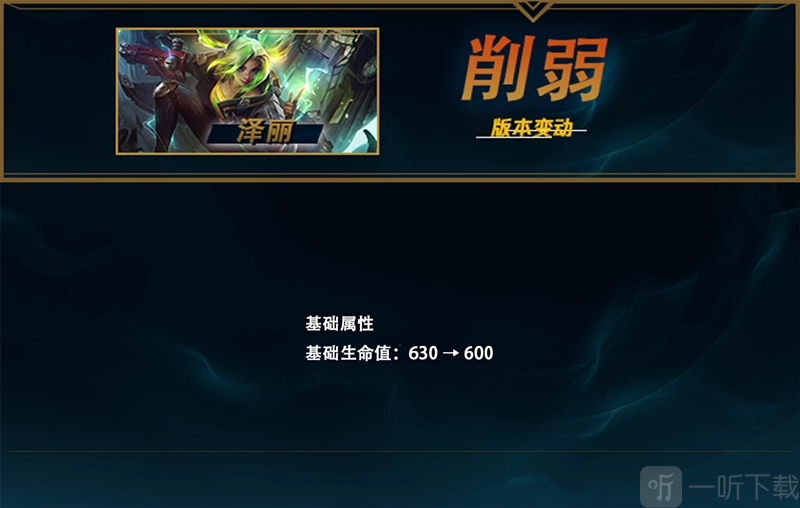 同样是赛场改动,削弱了30基础生命值,以降低其抗压能力,放大了其对线弱势的缺点。