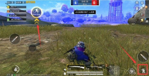 7、进入游戏后,用左手按住轮盘【持续冲刺】,同时右手点击【下蹲】按键,就能实现飞铲操作。