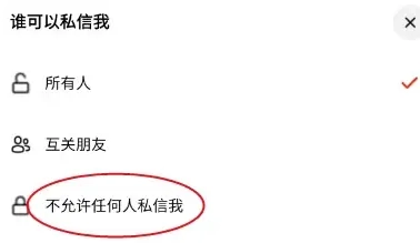 在弹出窗口中,点击“不允许任何人私信我”这个选项就行。
