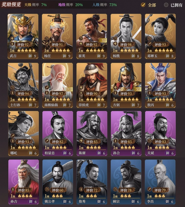 其余武将杨戬用处比较少,但传道术法很给力,可抽来传道。邓婵玉和土行孙玩弓兵阵容必抽。哪吒敖丙搭配个方弼这种提高生存能力的辅助,前期也会比较舒服。杨任评分低但性价比很高,阵容缺人也可以用。