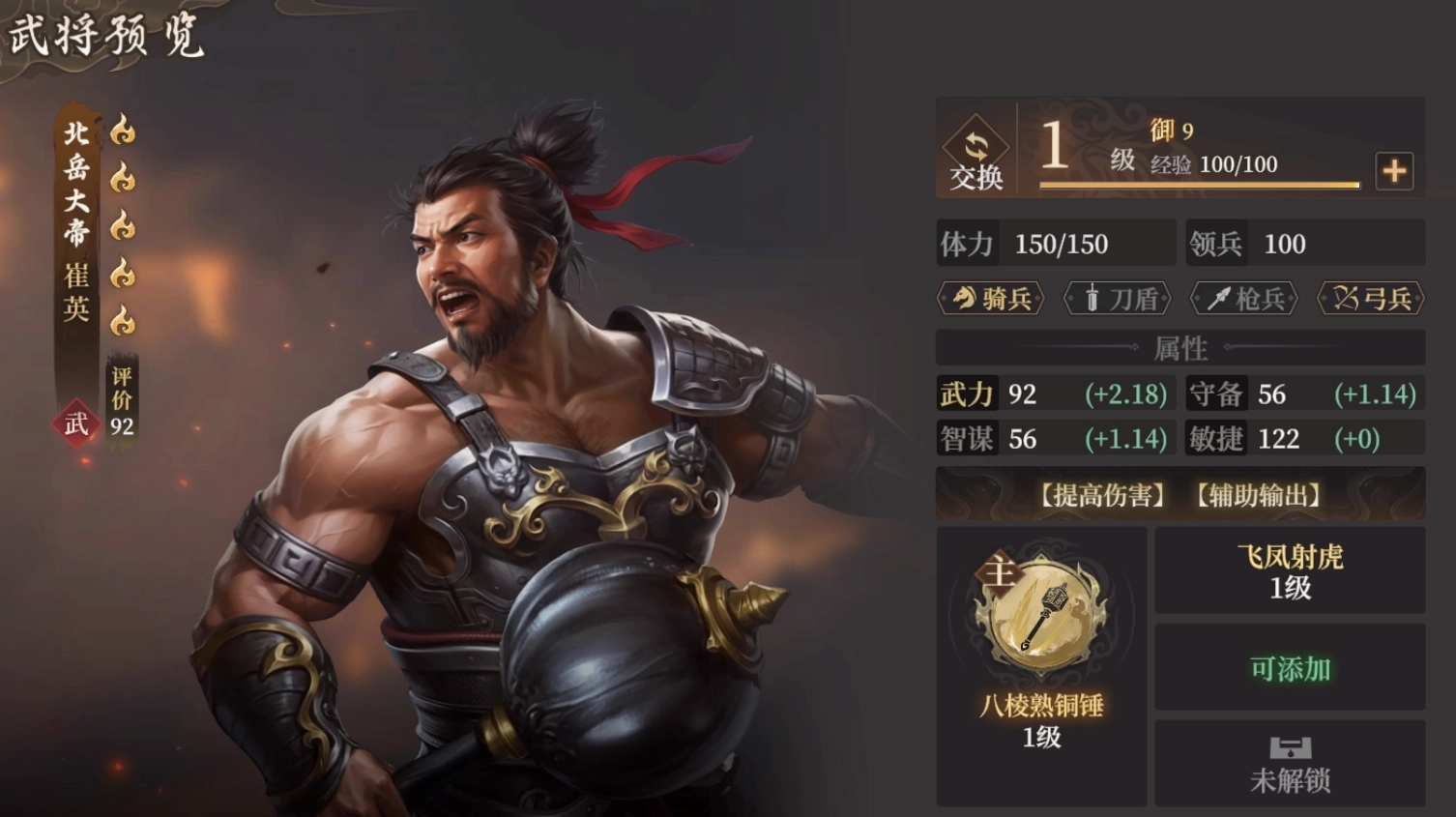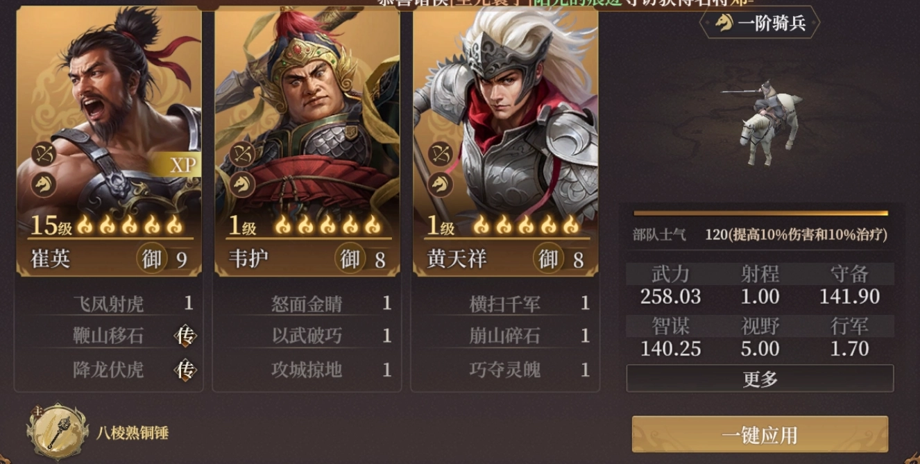 阵容方面,可以跟云游送的韦护搭配,第三人可选黄天祥、张奎、邓九公、晁雷等武将。韦护做主将负责打输出,崔英负责增伤,第三人定位灵活,可以给韦护当庚金叠层工具人,也可以补充伤害。