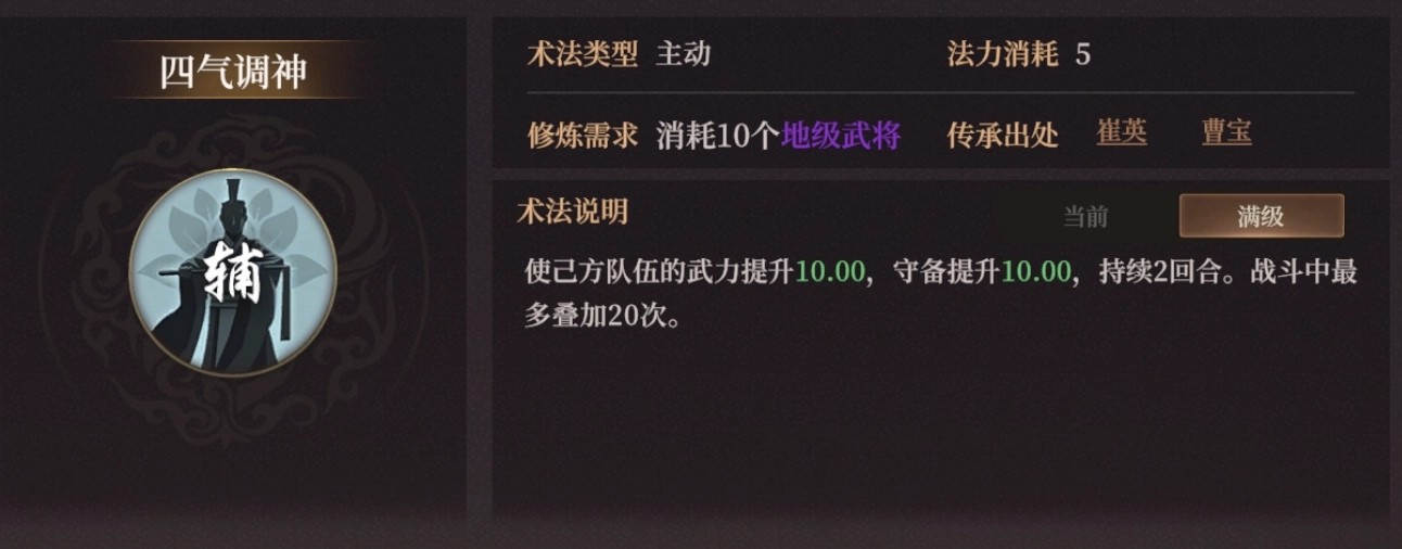 四气调神,来自崔英或曹宝传道。很有意思的叠层术法。满级哪怕只叠了10次,也有100武力和100守备的提升,适合给盾兵阵容用。如果脸好发动次数多,提升会非常大。