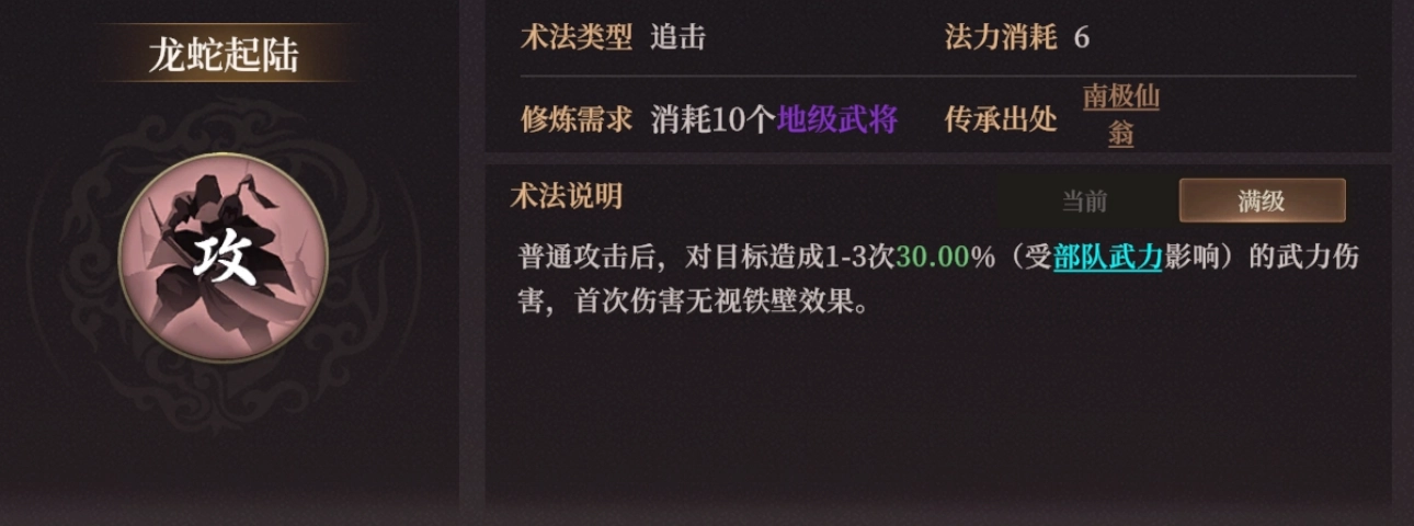 龙蛇起陆,南极仙翁传道获得。追击型术法,伤害倍率看脸。如果脸好触发3次伤害,90%的高倍率外加首次伤害无视铁壁的效果,打大部分队伍都会很疼。因此强烈建议多抽个南极仙翁用来传道。