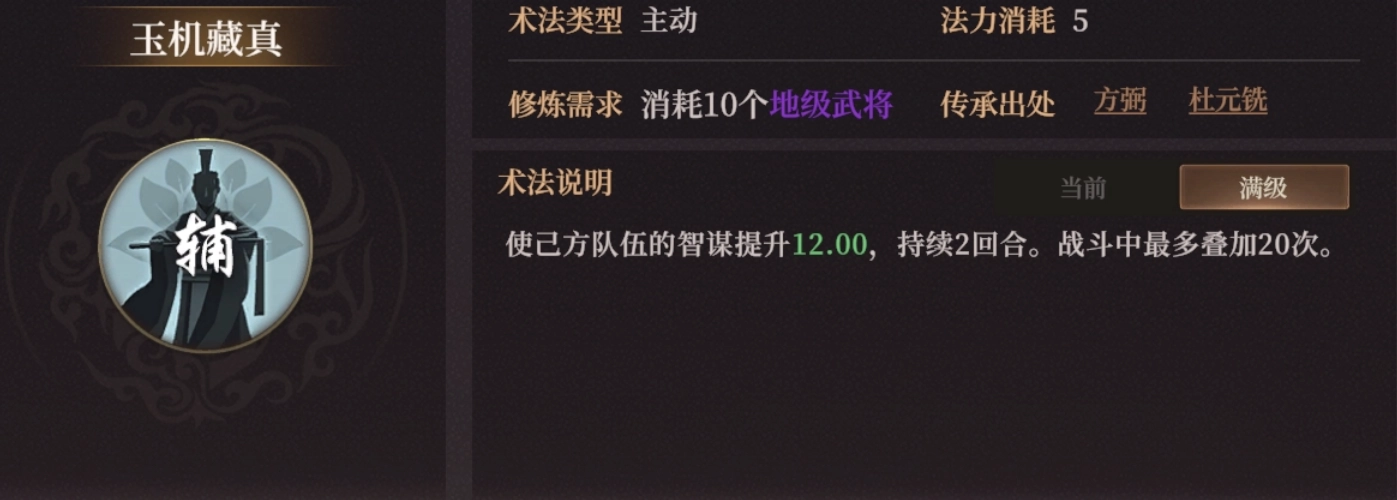 玉机藏真,方弼、杜元铣传道获得。又一个叠叠乐术法,满级最高可叠20层,提升全队240点智谋。跟前文说的类似,哪怕没叠满也很香了。