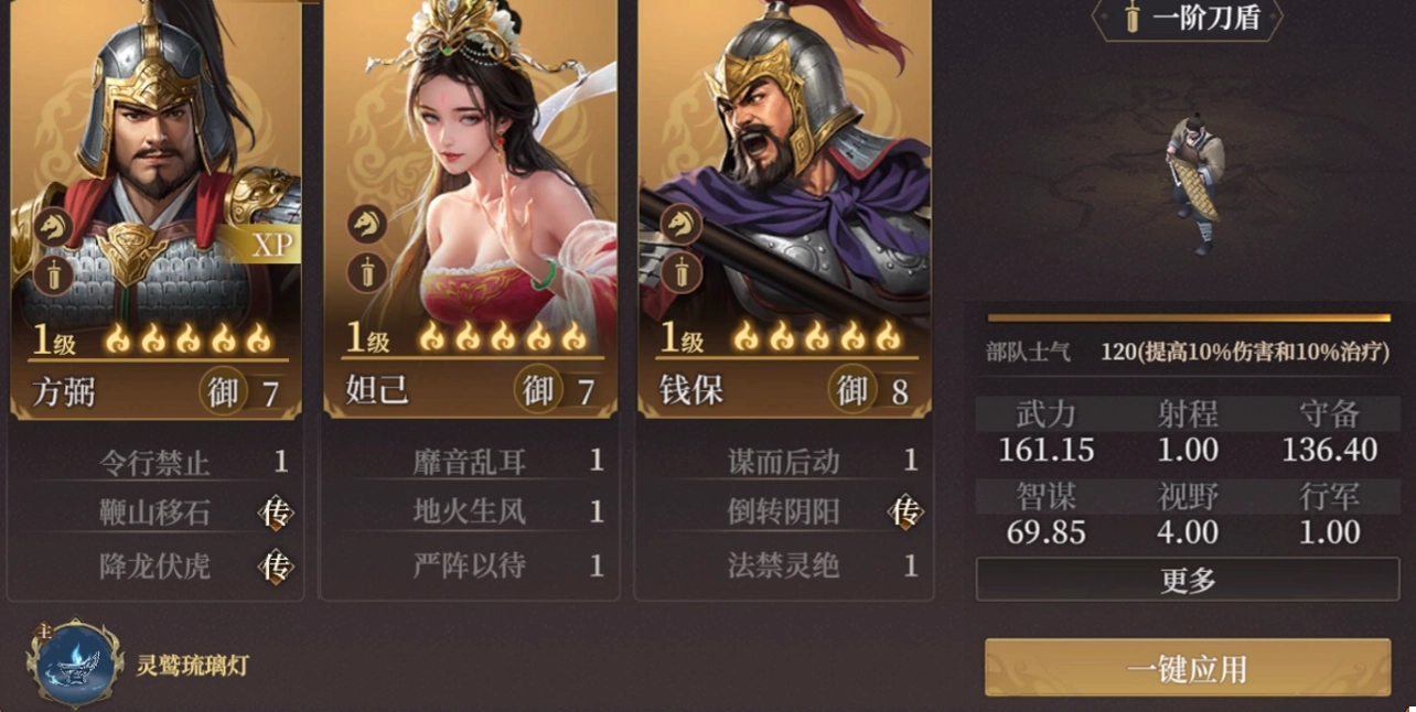 关于术法,椎锋陷陈、鞭山移石、以武破巧、降龙伏虎、柳叶金刀、裂甲披戈、釜底抽薪、雾锁烟迷、抱阴返阳、巧夺灵魄以及移精变气皆可选用。不过要留意,队伍里的三位武将不要都选择输出型术法,最好能安排一名武将携带回复续航类的术法。