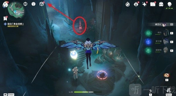 行至悬崖位置,朝着下方飞行,途中把旁边的传送锚点开启。接着继续向左行进。