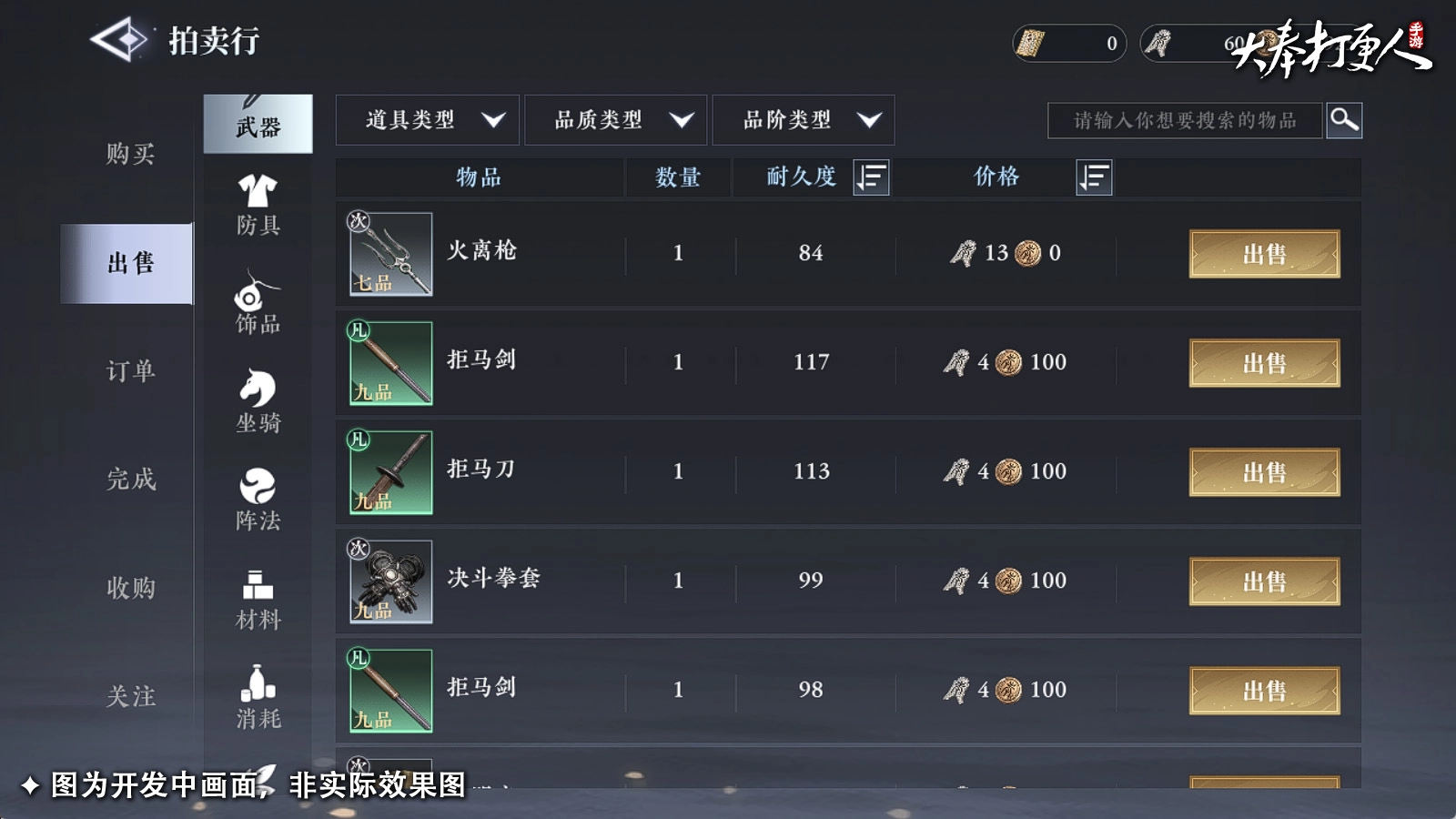 若急于出手神兵利器,点击武器选项,就能选择想要拍卖的神兵利器。
