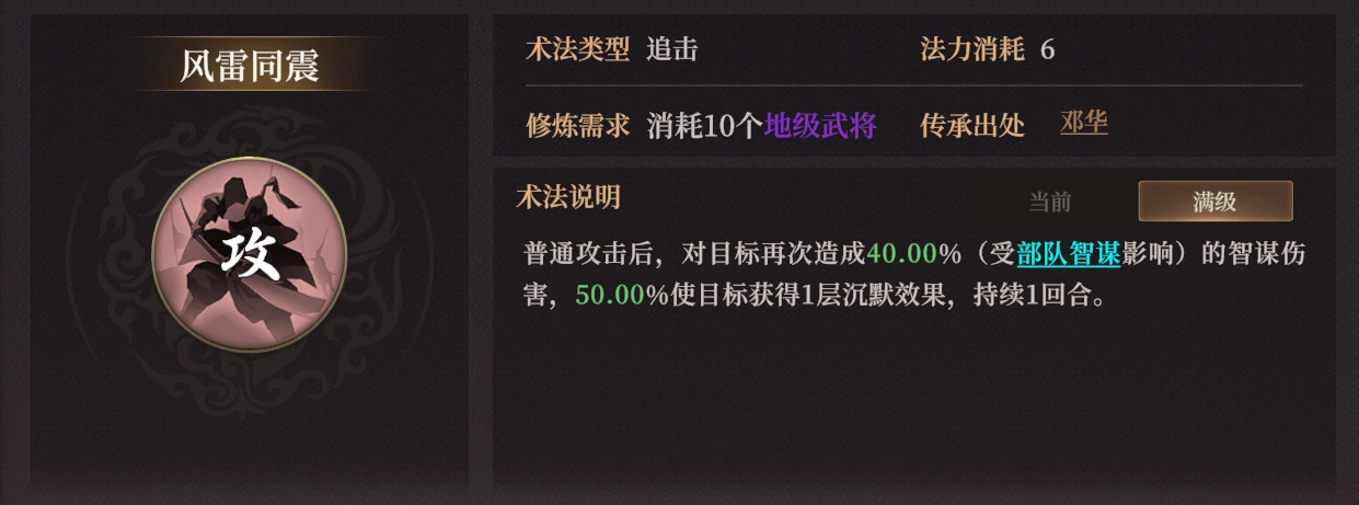 建议多抽一只用来获得传道术法【风雷同震】——不错的智谋伤害倍率,还有50%概率附加1回合的沉默,前后期都很实用。
