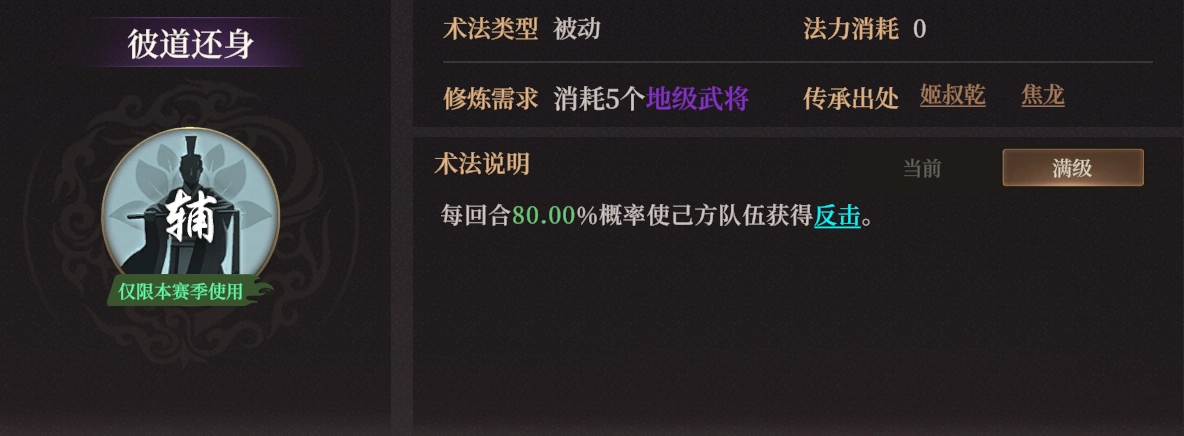自带术法以5回合为一个循环周期,在前三个回合会提高谋略伤害,后三个回合则能无视敌方守备。满级时数值达到50%,这一数值相对较高,能显著提升全队伤害。不过,从战报情况可知,该增益效果存在失效的情况(毕竟要是不失效,叠到233%就过于离谱超模了)。