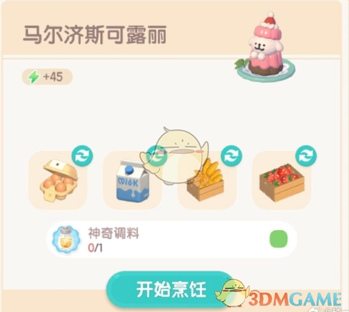 2、进入烹饪页面后,点击食谱,从中找到马尔济斯可露丽。接着准备1份鸡蛋、1份牛奶、1份麦子以及1份草莓,完成准备工作后,点击页面右下角的“开始烹饪”按钮。