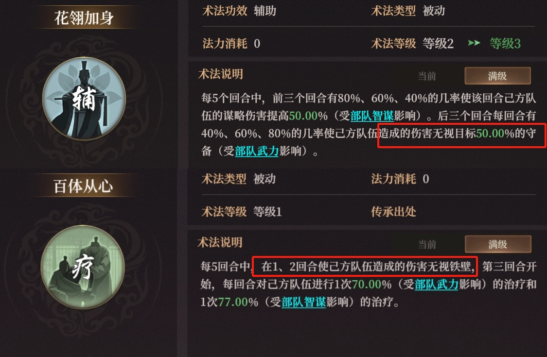 方相和碧霄自带的术法均以五回合为一个循环。当二者一同上阵时,在每五个回合里,前两个回合可使全队智谋伤害得到提升,且输出能无视铁壁效果;后两个回合不仅能无视敌方部分守备进行输出,还能大量回血。而第三个回合则存在运气成分(全命中概率为40%),最佳状况是智谋大幅提高,同时无视铁壁守备,还能获得治疗,如此既能打出极高的伤害,又能维持全队血量。