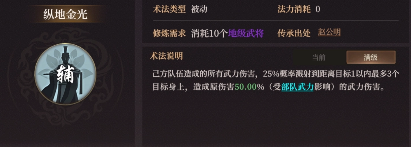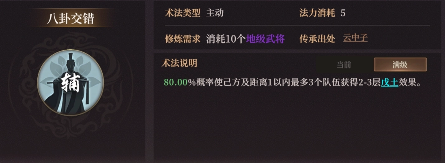 八卦交错,来自云中子。满级80%概率给最多3队上2-3层戊土,也就是8%-12%的减伤,以及8-%12%的持续回血。后期团战盾兵队辅助可带。没敢传道云中子所以不确定强度。