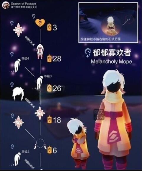 《光遇》夜行季里的“郁郁寡欢者”先祖特别让人印象深刻,他耷拉着脑袋、走路慢吞吞像没力气的样子辨识度超高,不少玩家都调侃这简直是当代年轻人精神状态的真实写照——又丧又有点可爱,想兑换他物品的人可不少!别被他垂头丧气的模样骗了,这位先祖能换的东西可丰富了:黄紫配色的棉裤、带斜刘海的发型、精致的象牙耳坠,还有那标志性的“垂头丧气”动作都能换。想知道这位忧郁又有趣的先祖在哪里吗?快跟着一起找找看吧!