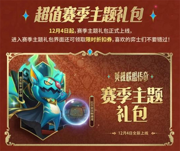 12月4日当天,赛季主题礼包将同步开启售卖。玩家们可以前往礼包界面领取限时折扣券,凭借这张券就能用非常划算的价格,把自己喜欢的小小英雄以及其他赛季专属道具收入囊中。