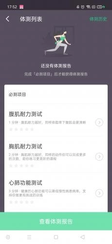 3、最后只需在【个人中心】里找到【身体测试】选项,接着点击【体侧列表】下方的【查看体测报告】按钮就可以了。