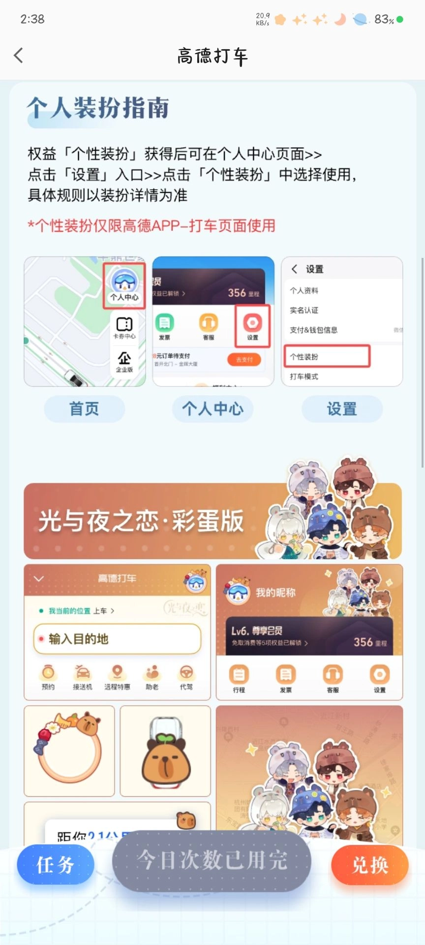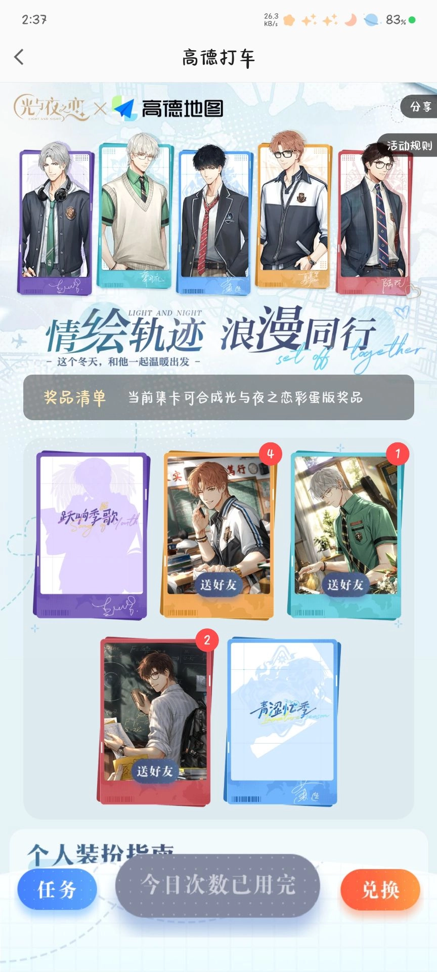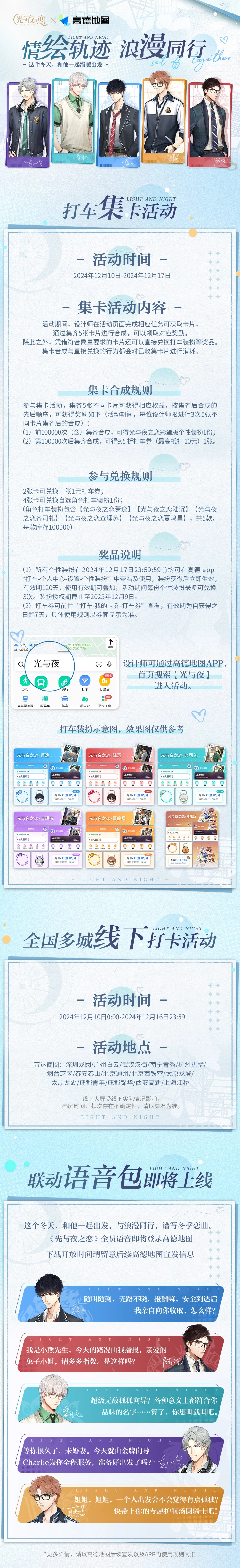 在活动期间,设计师们只需在高德地图中搜索【光与夜】,进入活动页面后完成对应任务,就能获取卡片。随后,可通过集卡合成或者直接兑换等途径,来获得角色打车装扮、打车优惠券等诸多奖励。
