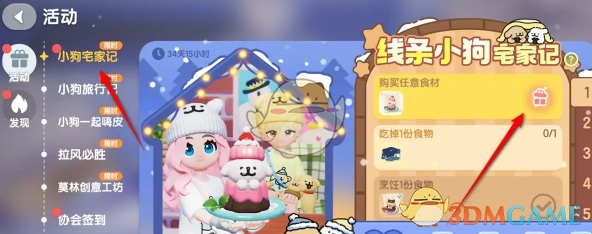 2、进入活动面板,找到“小狗宅家记”活动。在该活动界面的右侧,能看到活动任务,其中一项是购买任意食材。