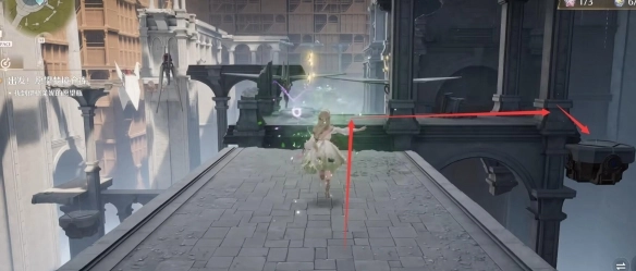 3、走到前方柱子处,将视角向右转,接着跳到对面的纸鹤上。