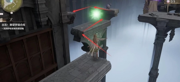 3、抵达图示所在位置后,跳到石台上,接着顺着左边的纸鹤向上跳跃。