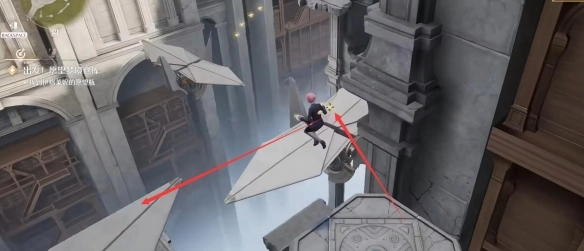 2、通过漂浮加速抵达对面的平台,然后沿着右边的纸鹤指引的方向一直向上行进。