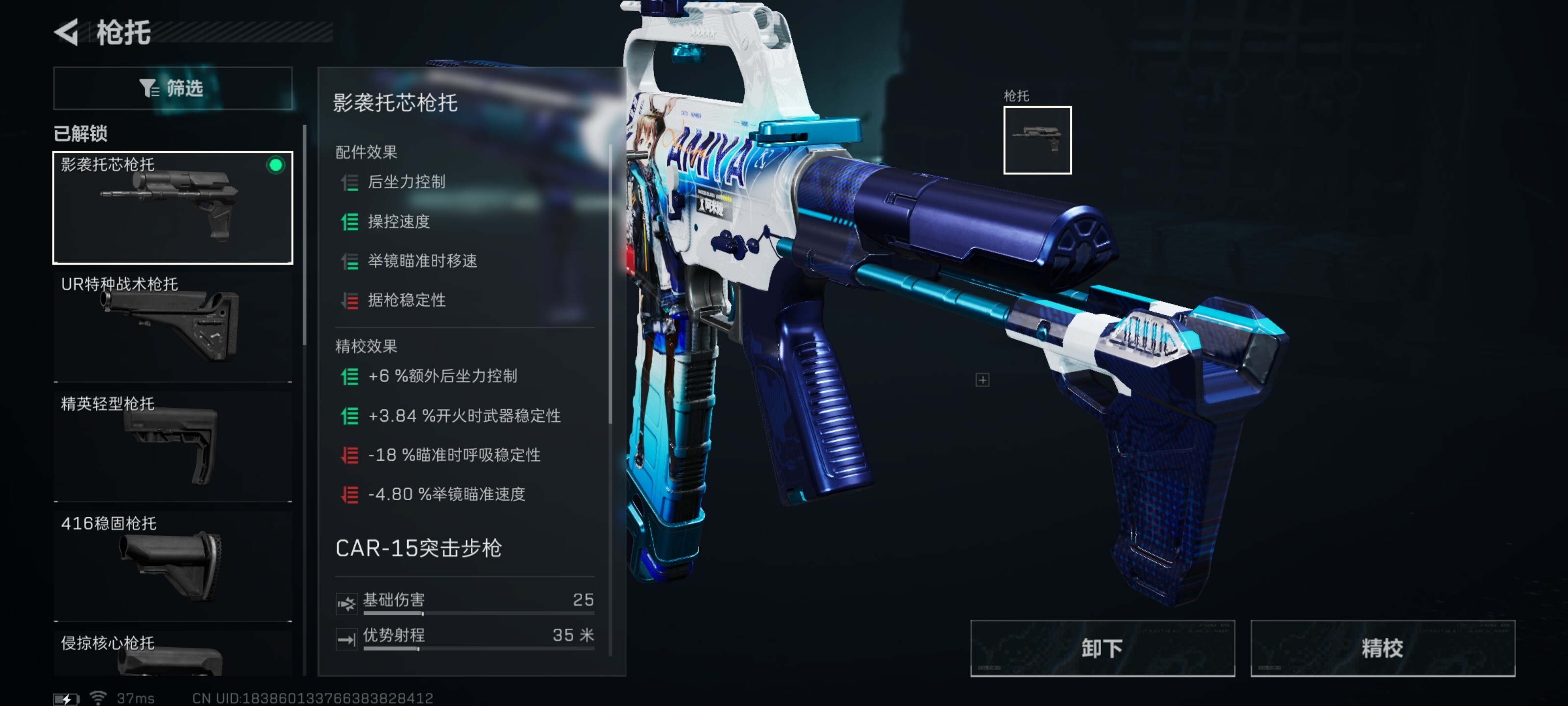 我选择影袭托芯枪托作为枪托部件,再搭配折叠握把这个前握把,这样就能抵消其他配件对操控速度造成的大幅负面削减,让整体操控速度得到显著提升。