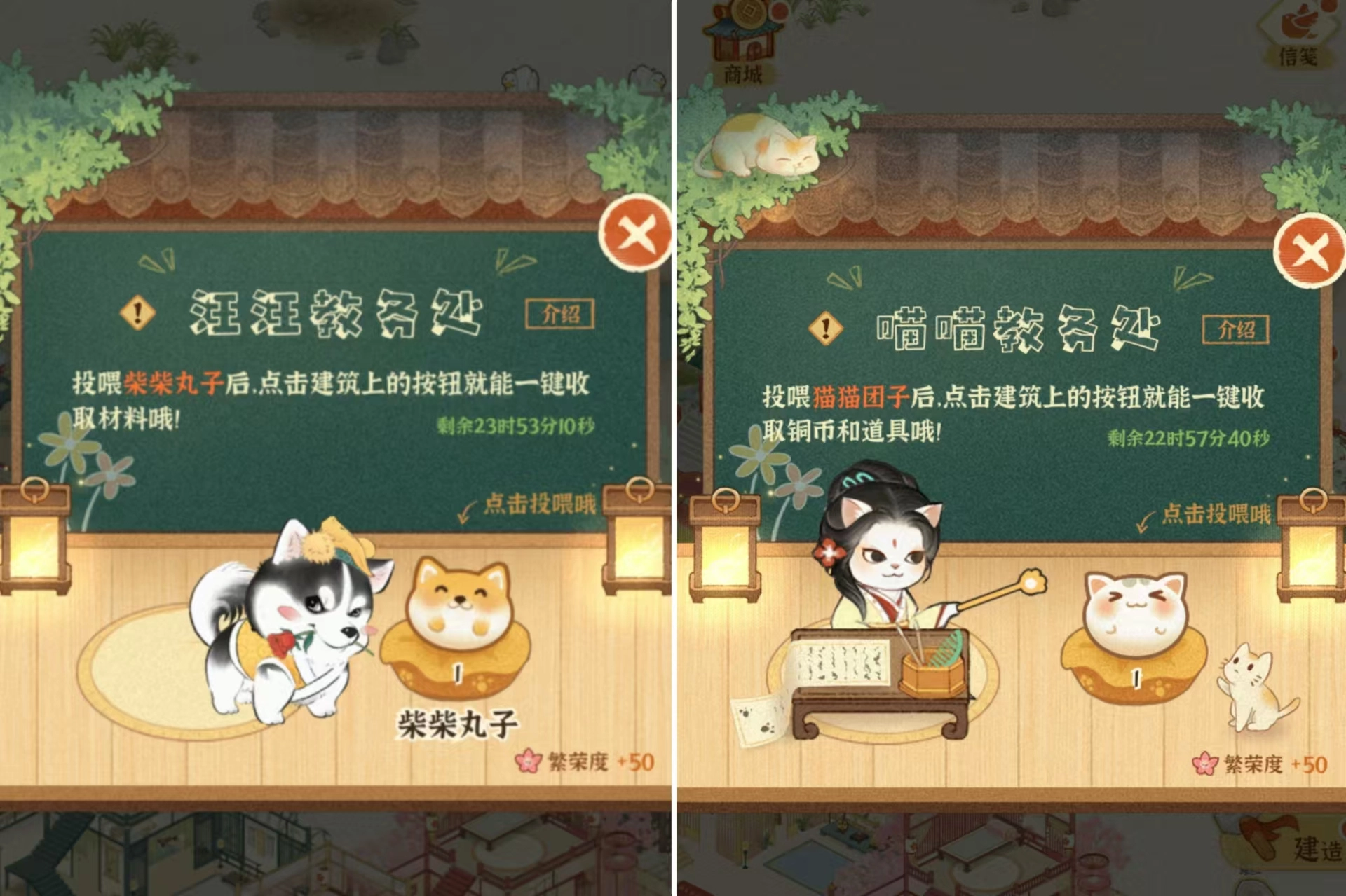 当太乐院升至4级,各位坊主便能建造「汪汪教务处」与「喵喵教务处」,只需投喂团子,就能一键收取资源,让各位坊主的手指轻松解放!(✪ω✪)
