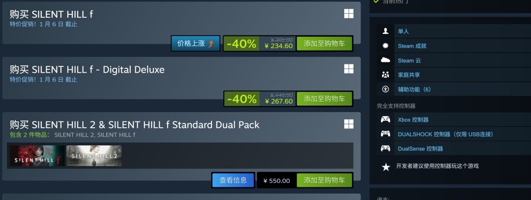 Steam今日启动冬季特卖活动,Konami于今年9月推出的3A级新作《寂静岭f》迎来了新的历史低价。这款游戏的标准版原价为391元,距离发售仅三个月时间,便开启了六折优惠,当前售价为234.6元。