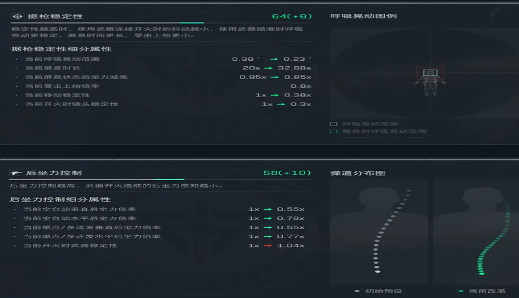 改装后有效降低了后坐力倍率,还延长了屏息时长,单点射击时稳定性更佳,连射过程中枪口上跳也更容易控制,很适合中近距离的持续输出。