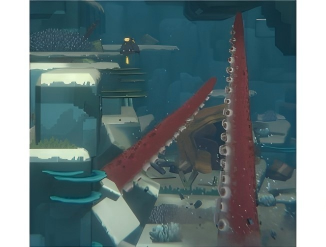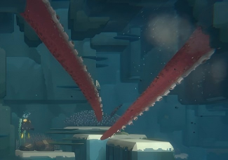 2、阶段二:将触手的位置往前移动,一旦看到烟雾冒出就马上朝后方(左侧)游动,躲到石头的后面等待触手缩回去。