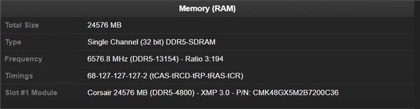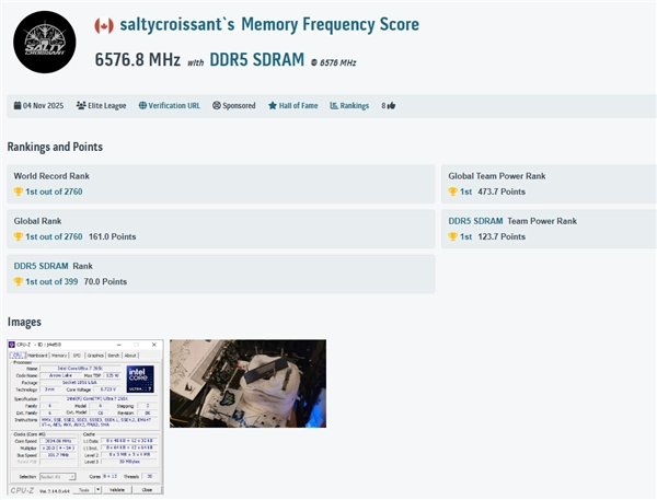 Saltycroissant采用一根24 GB的Corsair Vengeance DDR5内存条,与GIGABYTE Z890 AORUS Tachyon ICE主板及Intel Core Ultra 7 265K CPU相搭配,顺利将内存频率提升到了全新高度。
