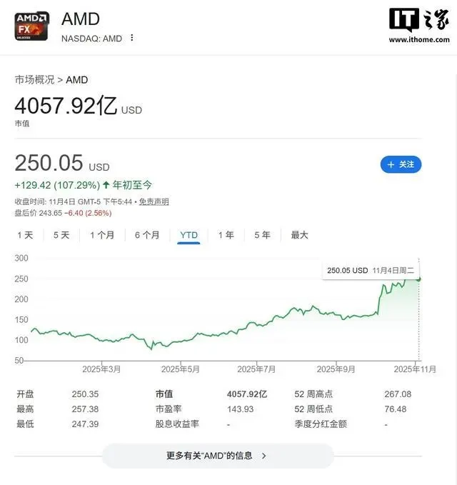 受一系列利好消息推动,AMD股价在过去一个月猛涨53%,今年以来的涨幅更是达到107%。不过在AI芯片领域,AMD依旧要面对行业龙头英伟达的强劲竞争。当前英伟达市值已超过5万亿美元,AMD市值则约为4180亿美元,想要追上还有很长的路要走。