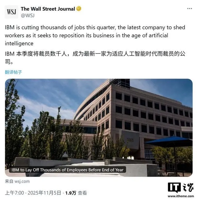 11月5日消息,媒体CNBC于昨日(11月4日)发布博文称,IBM计划在2025年第四季度启动新一轮裁员,预计受影响员工人数占其全球员工总数的比例为“较低的个位数”(low single-digit percentage)。