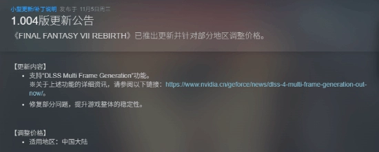 《最终幻想7:重生》的价格调整已于11月4日晚间正式生效,其中国区价格迎来大幅永久性下调!标准版价格从原来的446元降至当前的348元,降价幅度约为21.9%;豪华版则由原先的573元调整至448元,降幅约21.8%。