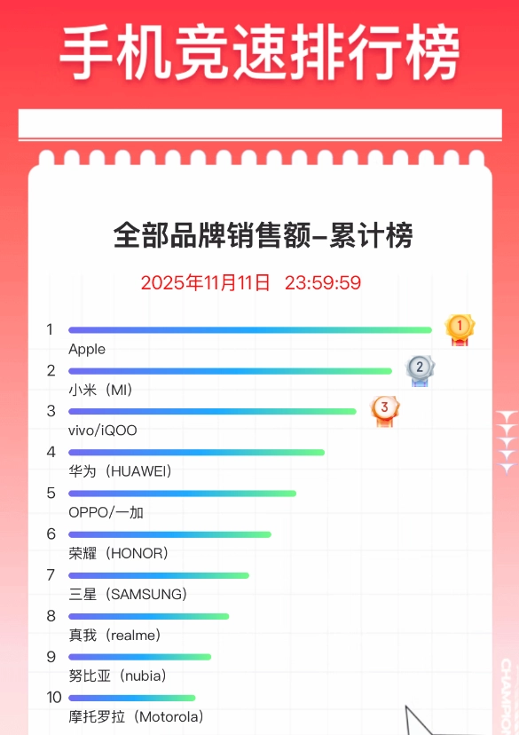 到11月11日23点59分59秒为止,苹果、小米、vivo在销量榜上占据了前三名的位置,这和大家之前预想的情况是一致的。