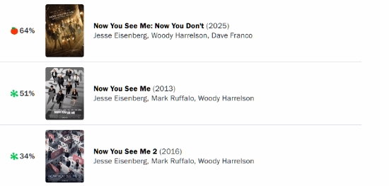 值得一提的是,到目前为止,这部作品是《惊天魔盗团》系列里烂番茄新鲜度最高的一部。系列初代的新鲜度评分是51%,二代则更低,只有34%!