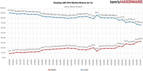 AMD在本季度达成了两项关键的里程碑:一是所有x86 CPU出货量份额首次超过25%,二是台式机x86 CPU份额首次突破三分之一(即33%)。